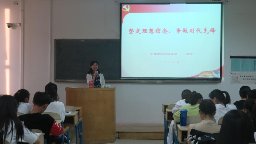 (图/徐佳慧文/马金泺)为帮助入党积极分子更加深刻地了解中国共产党,明确入党目的,坚定理想信念,2019年5月24日,行政党支部书记杨雪在教学楼A314为入党积极分子讲《做忠诚的爱国者》主题党课。