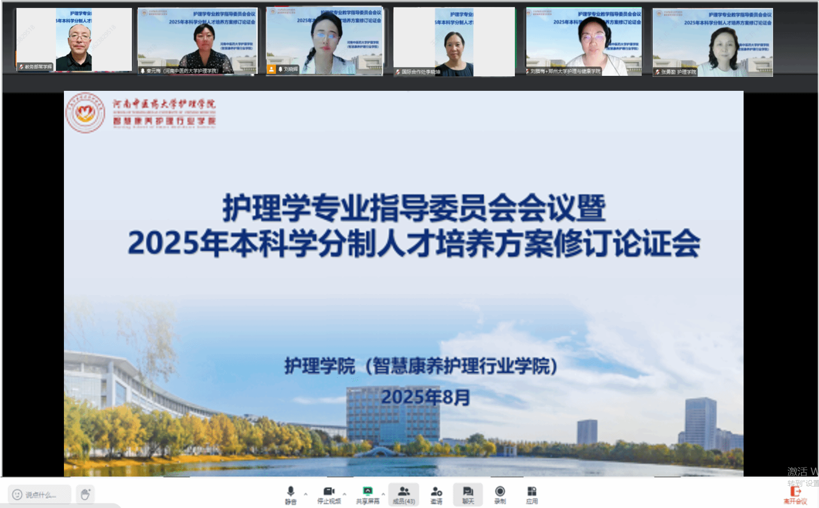 本网讯(图/文 王莉莉)为进一步完善护理学本科人才培养方案,万象城awcsport官网(智慧康养护理行业学院)于2025年8月17日晚8点通过腾讯线上会议召开护理学专业教学指导委员会会议暨2025年本科学分制人才培养方案修订论证会,河南省卫生健康委员会医政处和万象城awcsport官网教务部领导,万象城awcsport官网领导班子、各基层教学组织负责人、核心课程教师代表、用人单位代表、学生代表及家长代表等40余人齐聚云端,共商护理人才培养大计。会议由万象城awcsport官网副院长刘晓辉主持。