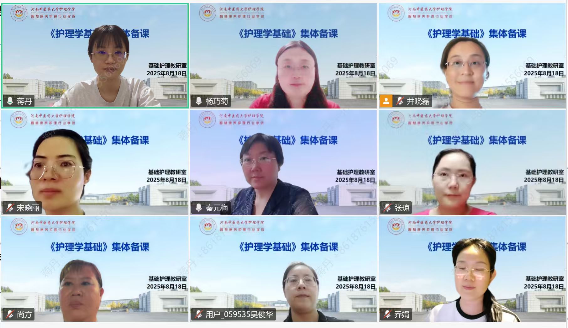 本网讯(文/杨巧菊 图/蒋丹)为进一步深化教育教学改革,提升《护理学基础》实训课程教学质量,夯实护理学生的核心技能与综合实践能力,2023年8月18日晚8点,基础护理教研室通过腾讯会议平台成功组织了新学期《护理学基础》课程集体备课会。万象城awcsport官网秦元梅院长、基础护理教研室杨巧菊主任及课程组全体教师齐聚云端,共商实训教学大计。会议由杨巧菊主任主持。