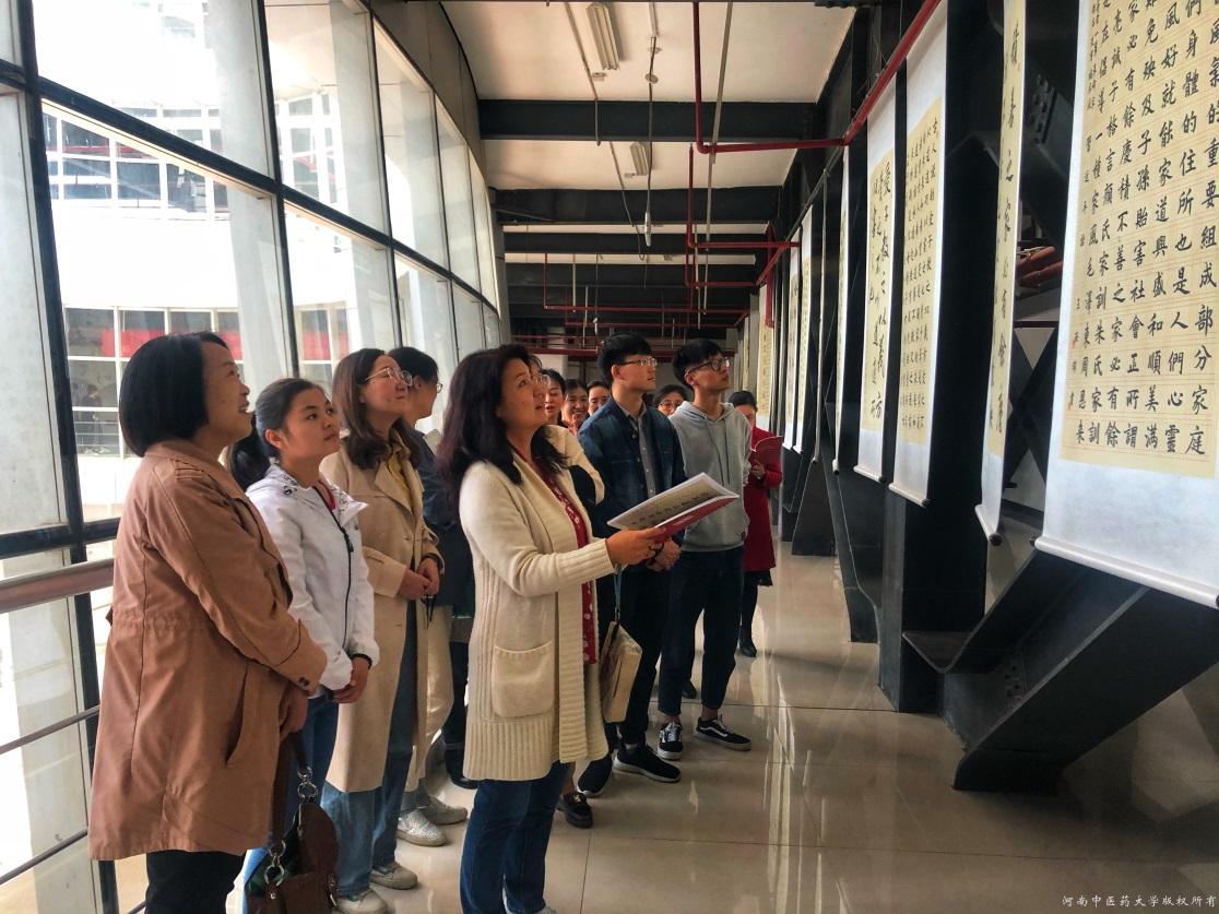 学院党委书记尹丽首先带队来到教学实验大楼6楼钢架结构大厅,参观由万象城退休教师王安邦教授根据人民出版社《平语近人·习近平总书记用典》收录的根据习近平总书记讲话中引用的35个典故创作而成的70幅书法作品,领悟秉持理想信念、坚守初心使命、不改革命本色的情怀。