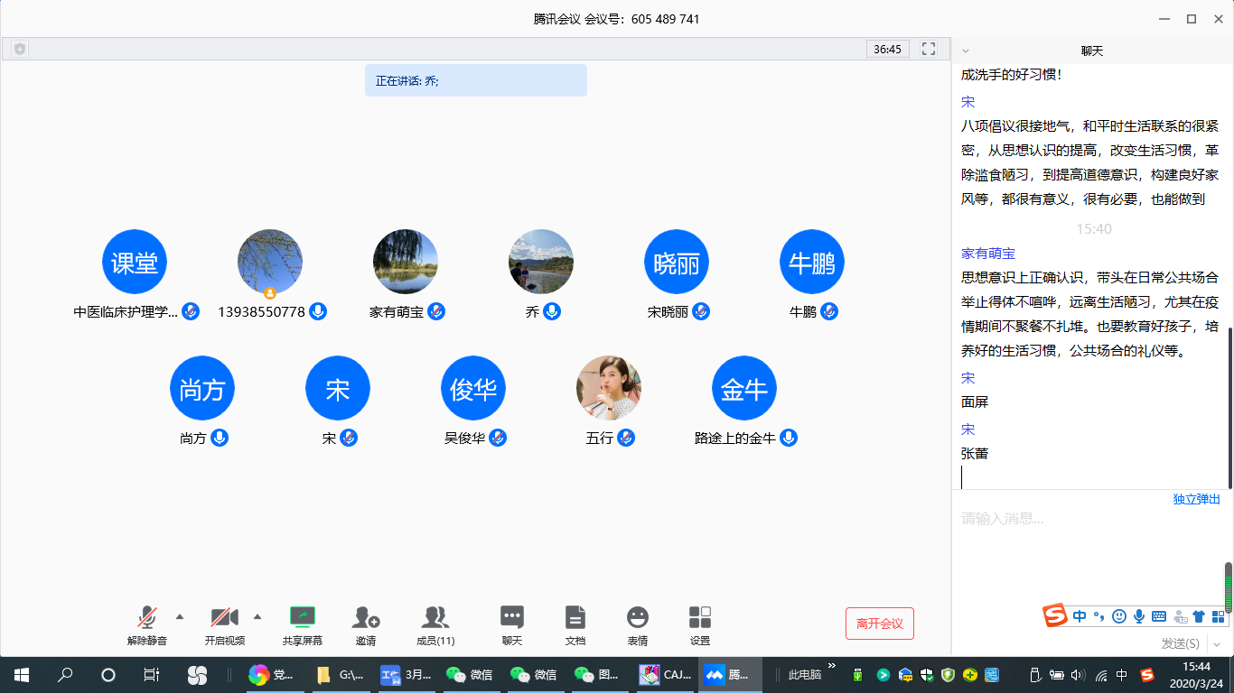 (文、图/王莉莉)2020年3月24日下午3点-4点,护理学科党支部通过腾讯会议举办在线主题党日活动,主题是“学习倡议我先行——践行文明健康、绿色环保生活方式”,支部书记杨巧菊同志带领全体党员学习省委组织部印发《关于发挥共产党员示范带头作用,推动形成文明健康、绿色环保生活方式的倡议》,针对倡议中的“八个带头”要求各位党员谈感受,查自身,作表率。党员们纷纷发表自己的看法: