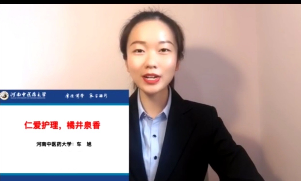 车旭同学在会议上发言的题目为《仁爱护理,橘井泉香》,介绍了八段锦、太极拳、耳穴按压等在疫情中发挥重要作用的中医药特色亮点,阐述了中医护理在疫情防控中的积极作用,倡议医学生要在构建和谐医患关系中展现使命担当。