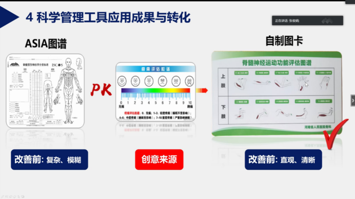 张俊娟主任辅导的品管圈圈组多次在品管圈大赛获得一等奖。她以“多维管理工具,助力护理质量提升”为题,从背景介绍、常用管理工具简介及差异点分析、管理工具在护理质量提升中的应用、常用品管手法难点解析及管理工具与科研五个方面进行详细讲解。通过分析问题解决型及课题达成型品管圈实战案例,让大家明确常用的科学管理工具的差异及用法。
