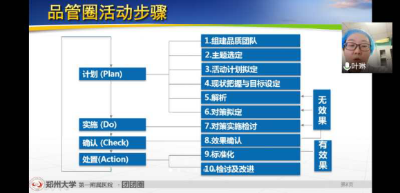 叶琳护士长作为郑州大学第一附属医院品管圈小组组长,参与辅导多个圈组获得全国和河南省品管圈大赛一等奖。她结合科室获奖品管圈案例,为同学们细致生动的讲解了品管圈各步骤如何开展及制图工具的应用。在授课中,叶护士长结合自身经历,强调了品管圈活动中制图工具的重要性及运用技巧。