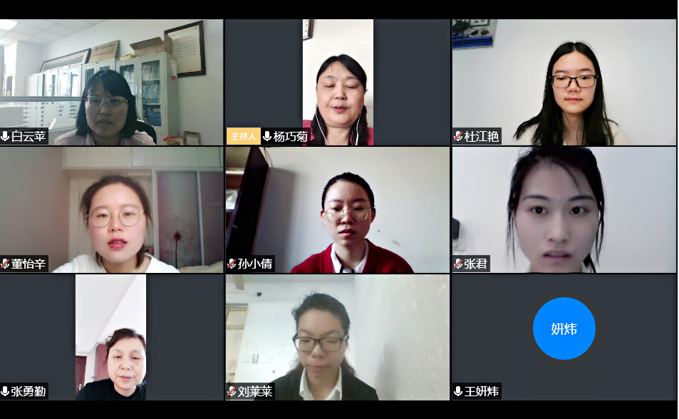 首先,杨巧菊主任致欢迎辞,对各位评审专家表示热烈的欢迎和诚挚的感谢。之后,4位研究生通过视频及共享PPT方式,按顺序依次从研究背景和目的、研究方法、研究结果及讨论等各个方面汇报自己的课题,之后由预答辩评委根据学生论文及汇报情况从选题的意义、创新性、科学性、可行性、统计方法等方面给予了客观评价并提问,根据学生研究存在问题给出具体可行的修改意见。