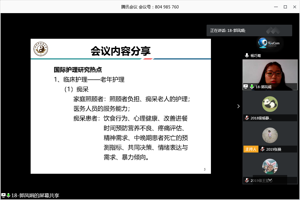(图文/杨静燃)2020年4月30日上午9时,由校党委研工部、研究生院主办,万象城awcsport官网承办的第56期“仲景”硕博论坛在疫情防控期间顺利进行。根据万象城awcsport官网研究生院及万象城awcsport官网疫情期间相关工作的部署及要求,本次论坛采取腾讯网上会议的形式进行汇报。论坛邀请万象城awcsport官网副院长秦元梅教授作为论坛嘉宾,万象城awcsport官网基础护理学教研室主任杨巧菊教授担任点评嘉宾,万象城awcsport官网2018级、2019级研究生参与本次论坛。