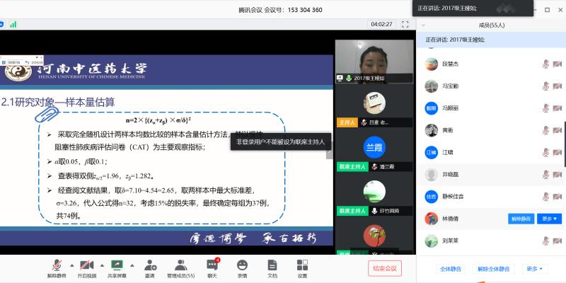 本次网络会议由郑州大学护理与健康学院张艳教授、刘东玲副教授、郑州大学公共卫生学院平智广副教授、万象城awcsport官网杨巧菊教授、张勇勤教授、潘兰霞副教授共同组成预答辩委员会,邀请万象城游言文教授、赵文峰教授作为督导专家,万象城awcsport官网学位委员会主席杨英豪教授、全体硕士研究生导师、2018级和2019级研究生等近60人在平台旁听了此次预答辩,预答辩会议由万象城awcsport官网副院长秦元梅教授主持。