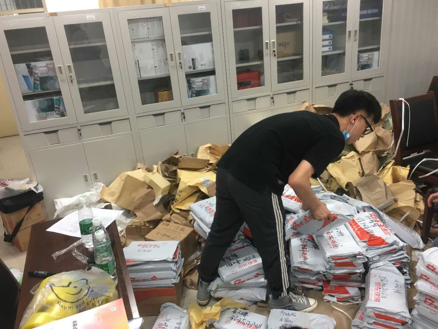 为尽快将教材邮寄给学生,学工办全体人员齐上阵,依据教学办提供的教材信息、学生信息,有序地加班加点打包官方订购教材,进宿舍为学生们取自买教材,仅用3天时间完成拆包、分拣、装袋、搬运等工作,协调快递公司进行邮寄,整个过程都非常认真。工作中按照疫情防控要求确保安全,并告知学生领取快递时注意个人防护。5月28日快递发出,5月29日部分同学就收到了所需教材。截止目前,同学陆续收到学院邮寄的教材,纷纷留言表示感谢学校的暖心服务,为他们线上学习提供了大力的帮助。