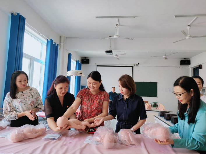 尹丽一行首先参观了信阳涉外职业技术学院校史展,详细了解校园发展历程、学院文化和办学特色。随后来到实训中心,实地了解该校护理专业实训室建设情况,护理学科主任杨巧菊现场进行了教学指导。