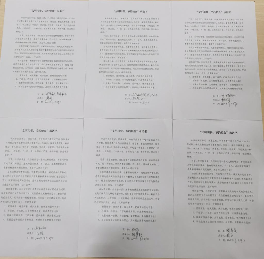 签订承诺书前,尹丽书记首先领学了习近平总书记重要指示精神,号召全体教师坚决制止餐饮浪费行为,积极营造浪费可耻、节约为荣的氛围。教职工纷纷表示要继续发扬艰苦奋斗、勤俭节约的优良传统,实施“光盘行动”,用实际行动为建设文明、和谐的校园贡献力量。随后的签字活动中,学院领导率先带头在承诺书上签字,全体教职工积极响应号召签名承诺。