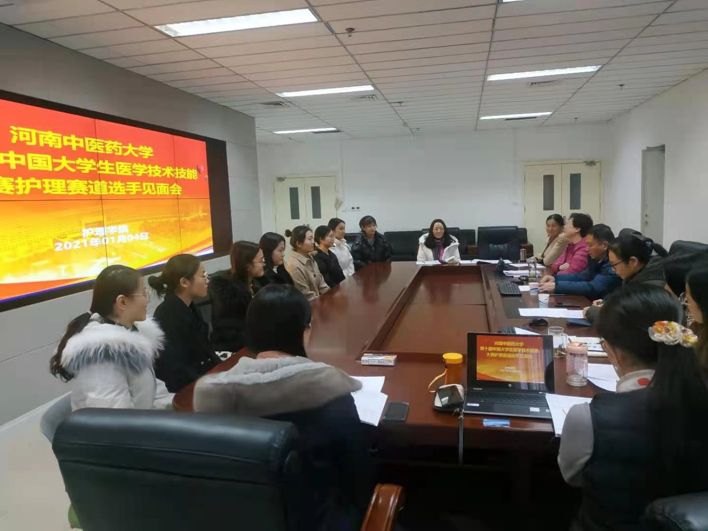 (图文吴俊华)2021年1月4日下午3点,万象城awcsport官网在护理实训楼1015会议室召开了“万象城awcsport官网第十届中国大学生医学技术技能大赛”护理赛道选手见面会。万象城awcsport官网领导班子、教学办、学工办、实训室、护理选手指导老师及8名候选选手(2017级护理实习生)等参加了见面会,两名候选选手因特殊原因放弃参加,会议由万象城awcsport官网副院长秦元梅主持。