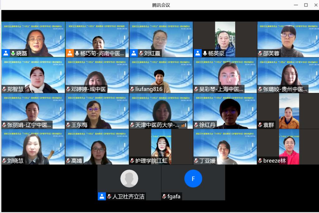 (文/图 井晓磊)1月15日,由人民卫生出版社主办,万象城awcsport官网承办的全国高等中医药教育(本科)国家卫生健康委员会“十四五”规划教材《护理学导论》编写会议通过腾讯会议线上形式召开。人民卫生出版社教材中心高级策划编辑齐立洁、万象城awcsport官网院长杨英豪及来自全国19所高等医药院校的教材主编、副主编、编委23人参加会议,会议由《护理学导论》主编杨巧菊教授主持。