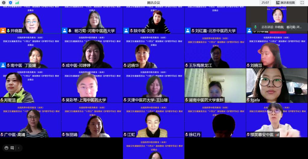 (文/图 井晓磊)3月13日,全国高等中医药教育(本科)国家卫生健康委员会“十四五”规划教材《护理学导论》编写定稿会依托腾讯会议平台召开,来自于全国20个高等医学院校的21位专家参加了会议,会议由教材主编杨巧菊教授主持。