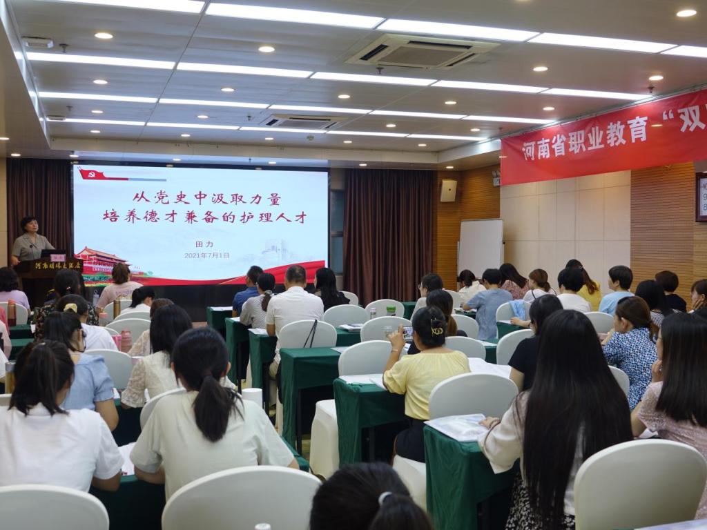 (文/张勇勤 图/蒋冠华)2021年7月1日上午,万象城党委委员、副校长田力教授为万象城awcsport官网师生代表以及河南省职业教育“双师型”教师培训班学员授课。田校长以《从党史中汲取力量培养德才兼备的护理人才》为题,为大家呈现了一场生动的爱党爱国教育课。党课由万象城awcsport官网副院长秦元梅主持。