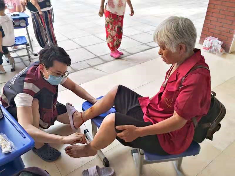 在支援卫辉的日子里,一天在家人的搀扶下,一位老奶奶来到了诊断队所在的诊疗点,侯思伟赶紧迎上前去,把老奶奶搀扶到座位上,仔细查看老奶奶右侧小腿上的伤口,当时伤口已经溃烂流脓,老奶奶诉说整个小腿疼痛,候思伟一边和老奶奶拉家常,一边动作轻柔地处理伤口,在老奶奶不知不觉中完成了伤口的处理和包扎。包扎结束后,老人连连感谢:“没想到男孩子也这么轻柔,太谢谢你了!”