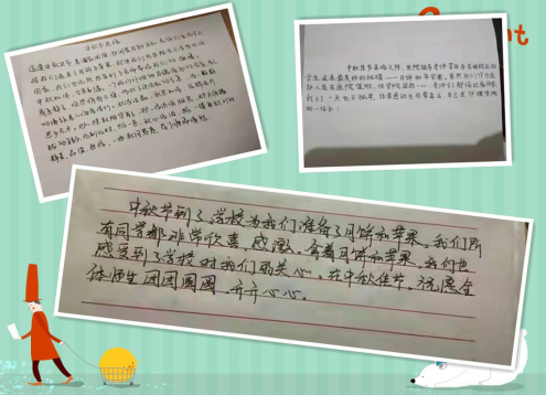 一盒盒月饼和红彤彤的苹果给大家带来了节日的气氛,让中秋节不能回家团聚的同学们感受到了学校和老师们的关心和关爱,感受到了节日的温暖和亲情,心里增添了一份感动。同学们也纷纷对老师们的关心表示了感谢,有的同学写出小纸条向老师们吐露心声送上了自己的节日祝福。