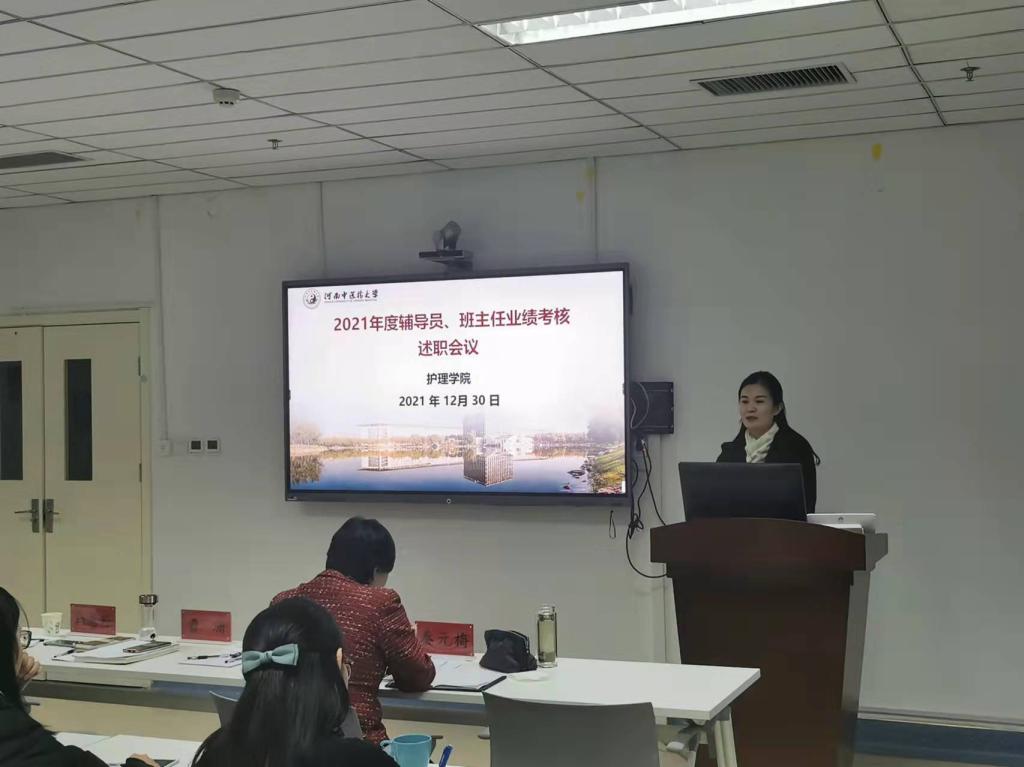 马慧玲首先传达学校《关于开展2021年度辅导员工作业绩考核的通知》、《关于开展2021年度班主任工作业绩考核的通知》文件精神,对两个文件进行了深入解读,说明学院将从德、能、勤、绩、廉、学等方面进行考核。随后,班主任、辅导员围绕思想政治教育、学风建设、党团建设、心理健康教育、就业指导等方面依次进行述职,总结汇报学生教育管理方面的成效。考核工作领导小组综合老师们的实际工作表现进行了考核打分。
