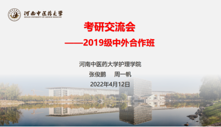 (图/张俊鹏 文/周一帆)2022年4月12日,护理研究生“驻班助研团”通过腾讯会议对大三同学开展了考研交流会,本期由“驻班助研团”的2021级护理研究生张俊鹏和周一帆主讲。2019级护理学中外合作本科班全体学生参加此次交流会,会议由2019级本科生陈曦主持。