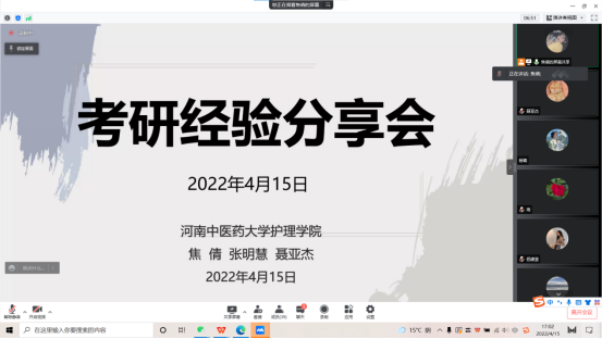 (图/聂亚杰 文/焦倩)2022年4月15日,护理研究生“驻班助研团”通过腾讯会议对大三同学开展了考研交流会,本期由“驻班助研团”的2021级护理研究生焦倩、张明慧和聂亚杰主讲。2019级护理学(保健英语)一班全体学生参加此次交流会,会议由2021级护理研究生焦倩主持。