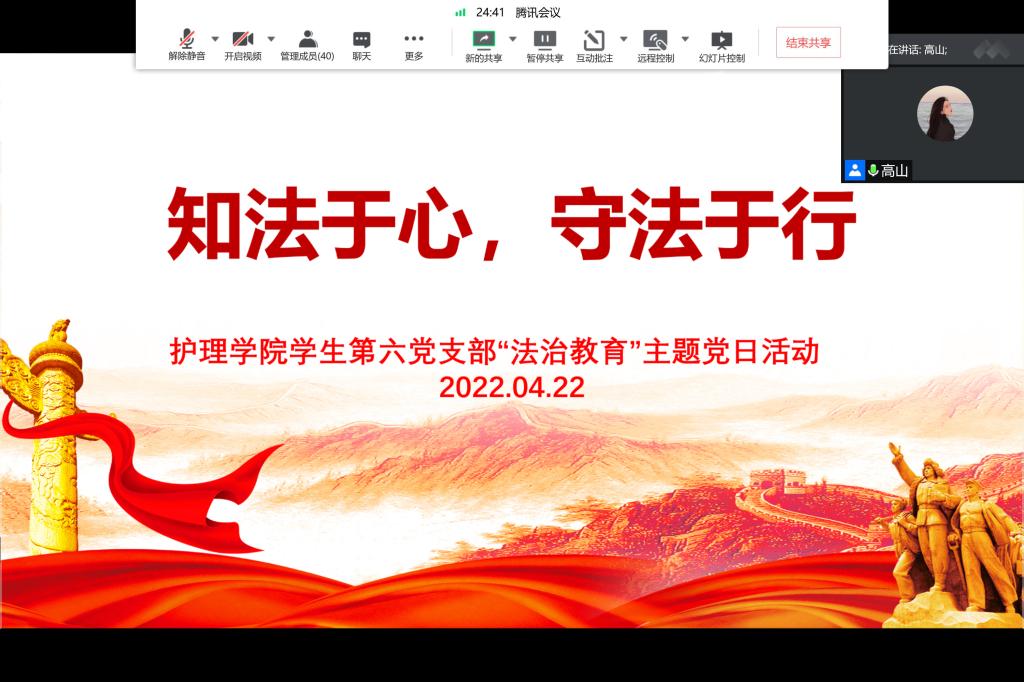 (文/图 胡亚哲)为深入学习贯彻习近平新时代中国特色社会主义思想,落实习近平总书记关于教育的重要论述和习近平法治思想,认真落实教育系统“八五”普法规则,提升青年学生党员法治素养,2022年4月22日晚,万象城awcsport官网学生第六党支部通过腾讯会议召开“知法于心,守法于行”法治教育主题党日活动。作为中国特色社会主义事业合格的建设者和可靠的接班人,理应具备法治意识与法制观念,因此加强大学生法治教育应作为重中之重的任务。