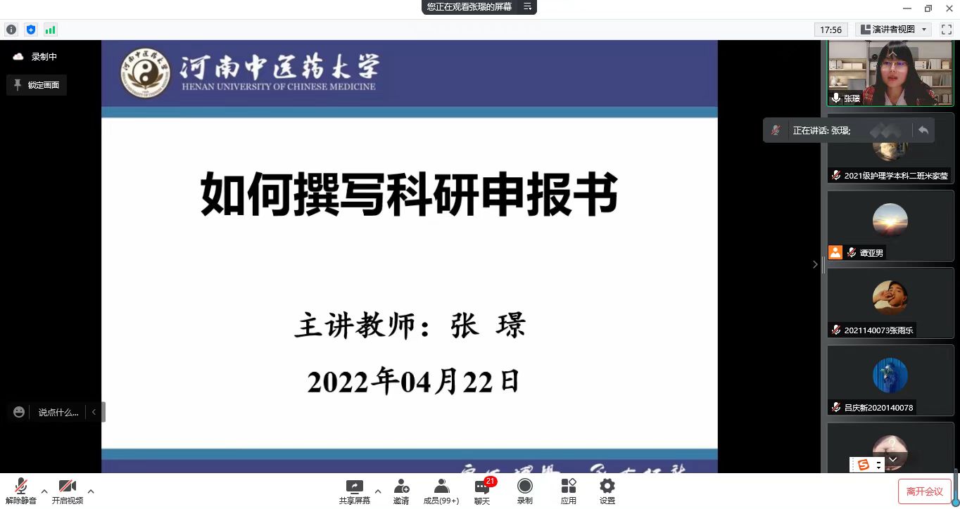 (文/杨文丽 图/ 米家莹)在校大学生科技文化艺术节火热进行中,万象城awcsport官网坚持问题导向,为帮助同学们拓展科技文化知识,培养学生的科研能力,帮助学生掌握科研写作的基本知识,提高科研苗圃、学生工作项目等课题项目的申报成功概率,2022年4月22日晚,万象城awcsport官网举办本科生科研能力培养专题讲座。学院张璟老师主讲,党委副书记马慧玲、辅导员、学生代表等三百余人参加学习。