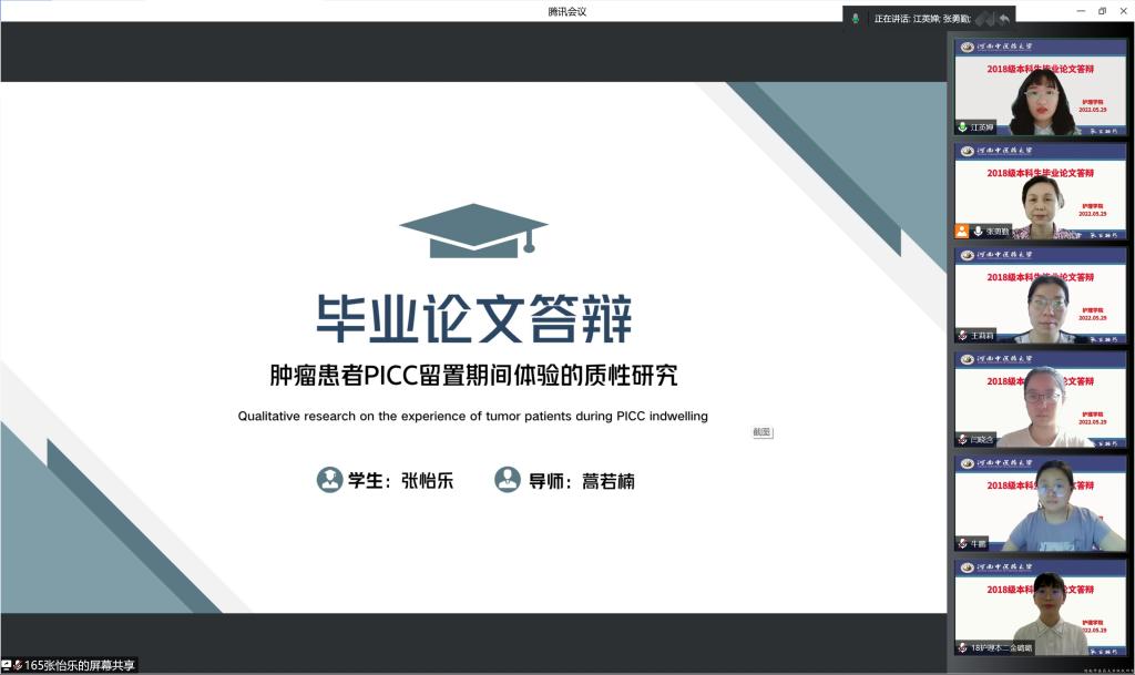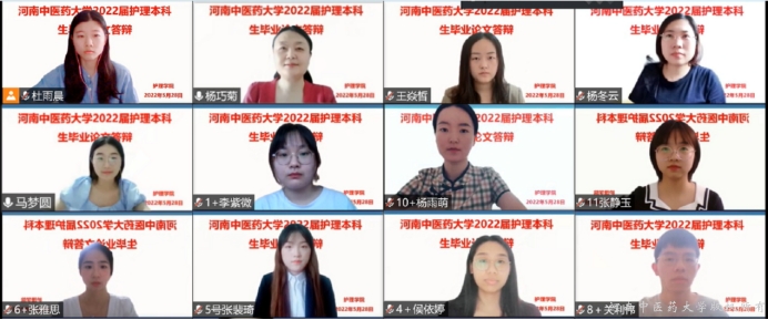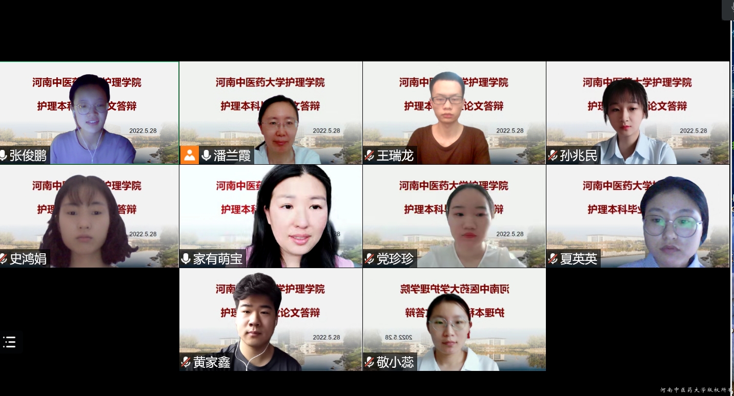 本网讯(文/马梦圆 图/杜雨晨 张勇勤 潘兰霞)为进一步加强本科毕业论文工作,全面提升本科教学质量,2022年5月27~28日,万象城awcsport官网开展2022届护理本科生毕业论文答辩工作,答辩会以腾讯会议的形式线上举行。本次答辩由万象城awcsport官网基础护理教研室主任杨巧菊、内科护理教研室主任张勇勤、外科护理教研室主任潘兰霞担任答辩组组长。