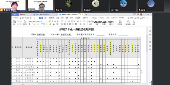 教学办张琼主任对护理学专业-课程思政矩阵图、暑期工作总结及秋季开学安排、2023年护理专业认证等工作进行了汇报,对2022年河南省课程思政课程申报文件进行了解读,并组织大家讨论;杨巧菊主任对护理学专业-课程思政矩阵图发表了看法,并分享了河南省课程思政样板课程申报工作经验。