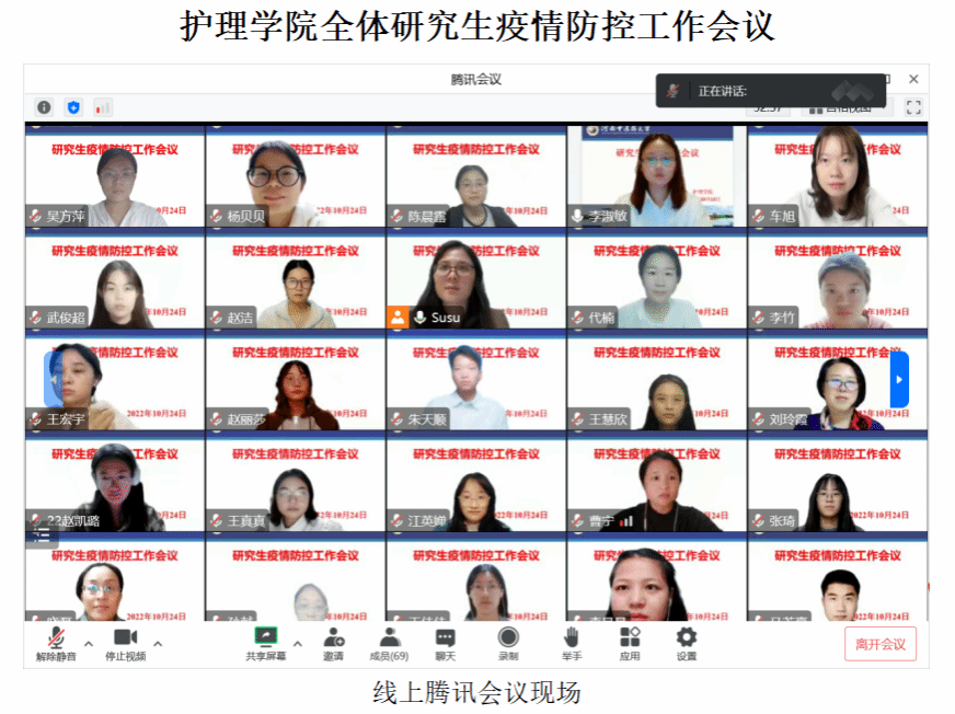 首先,吕素老师向同学们讲解了疫情防控现状,强调同学们要严格遵循学校的疫情防控政策,配合做好疫情防控各项工作,多理解工作人员不易,积极参加志愿服务。同时鼓励同学们积极参加研工部举办的 “仲景学术活动月”活动,锻炼自己的科研能力,丰富疫情下的日常学习生活。井晓磊主任向大家讲解了科研、学习方面的内容,强调各年级的学习任务,希望大家在疫情封控期间利用好时间做好科研,完成学业要求。最后,刘玲霞副院长再次强调了全体研究生要配合学校疫情防控工作,希望全体研究生做到对自己、学校和社会负责,同时强调了在疫情封校期间,同学们要学会合理放松心情,调节不良情绪,在紧张的防疫氛围下放松身心,希望大家携起手来,共克时艰。