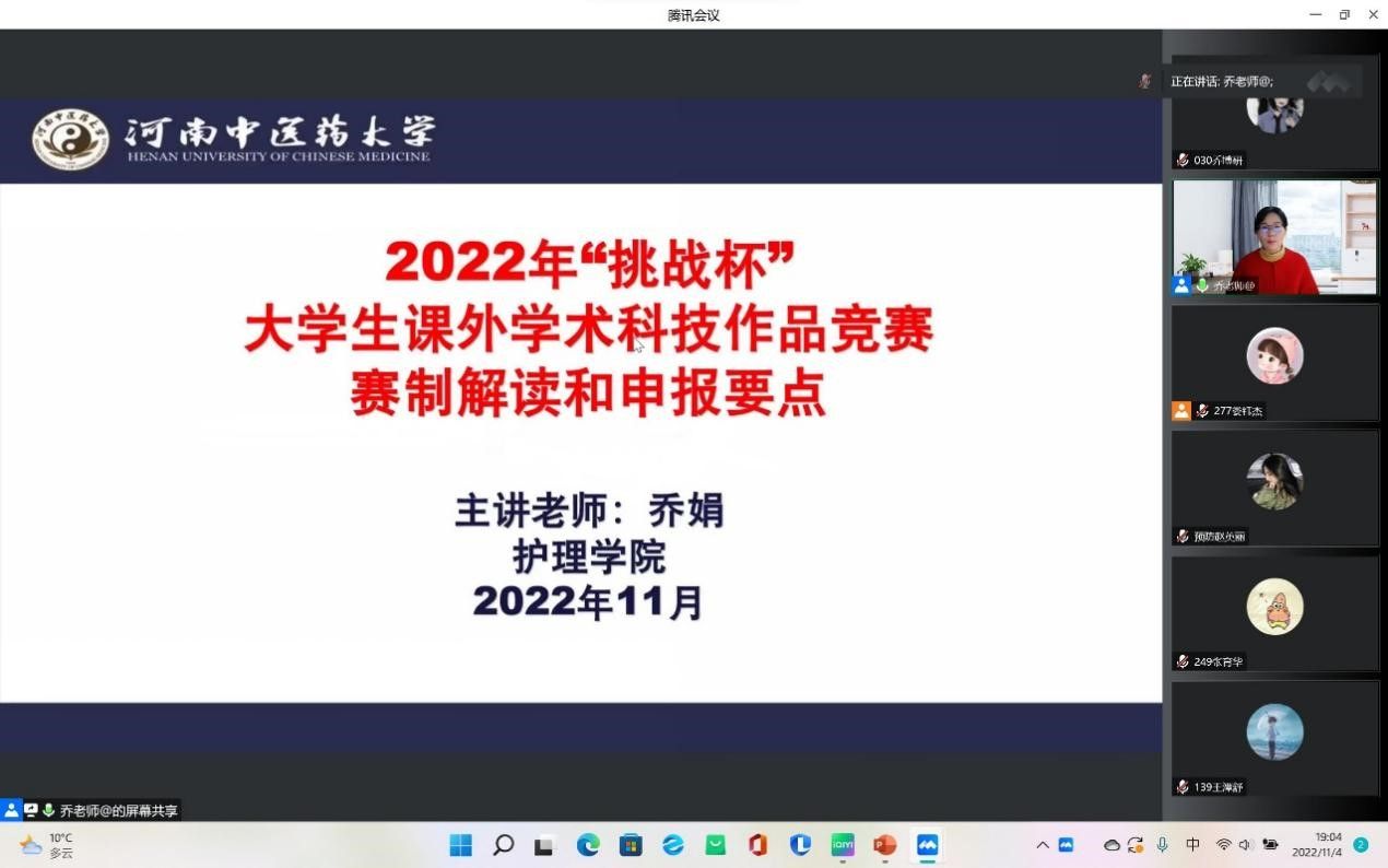 (图/乔博研 文/胡亚静)为进一步提升“挑战杯”大学生课外学术科技竞赛团队备赛质量,帮助同学们打磨参赛作品,提高学院竞赛水平,11月4日晚上,万象城awcsport官网组织了“挑战杯”赛制解读和申报要点线上培训。本次培训邀请到了万象城awcsport官网乔娟老师为大家讲解。全院学生代表300余人参加学习。