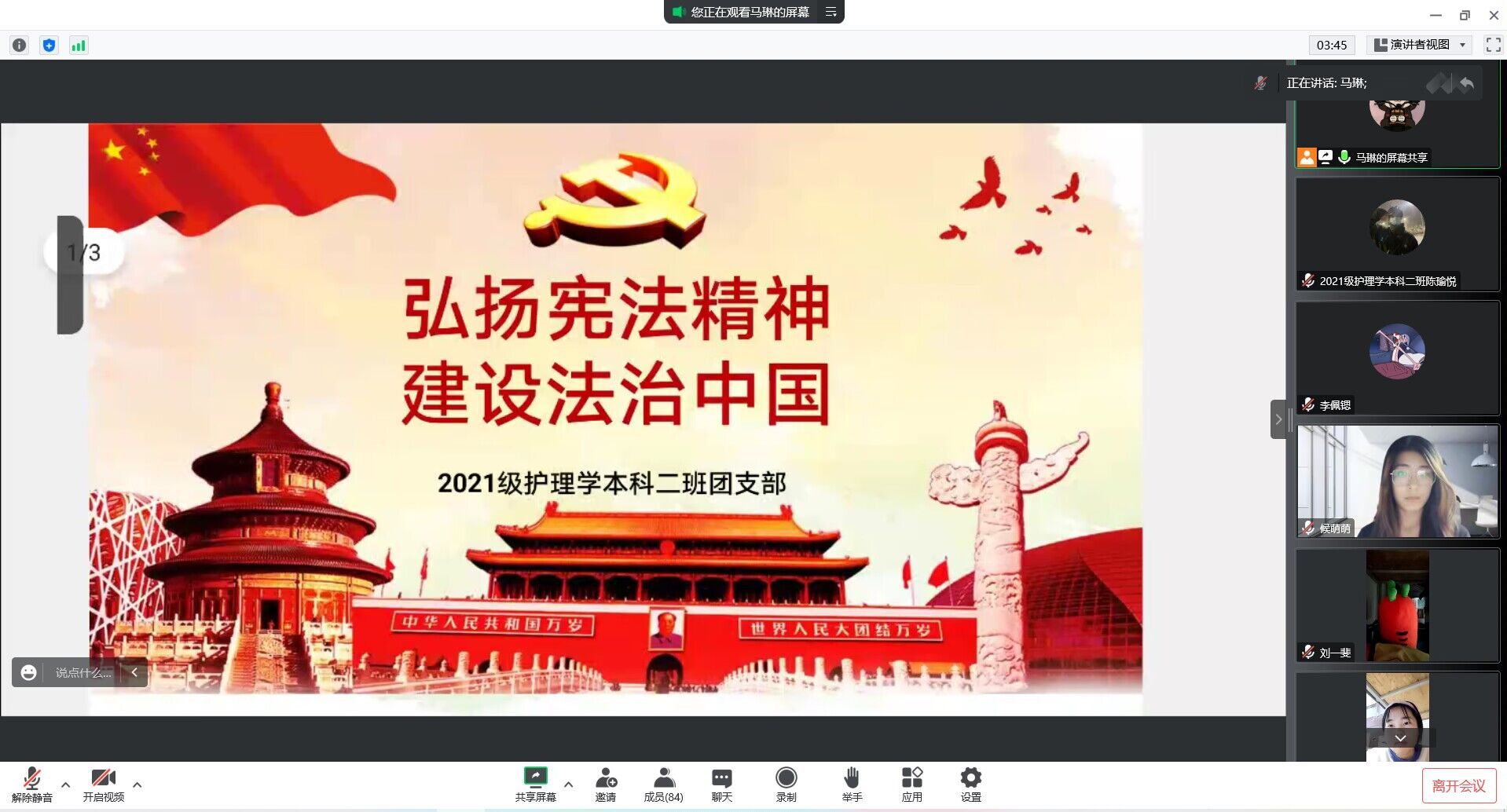 支部三会一课,分类分层学习。各支部结合“三会一课”组织线上学习宪法知识、党章和其他党内法规,增强师生党员的法制观念和法律意识。教工党支部通过观看宪法宣传片和《宪法》原文学习,了解《宪法》的产生和不断修正完善的历史过程,深刻理解《宪法》精神;学生党团支部带领同学们深入学习宪法相关知识和社会主义法律相关内容,并以小组的形式对所学到的宪法知识进行讨论交流。