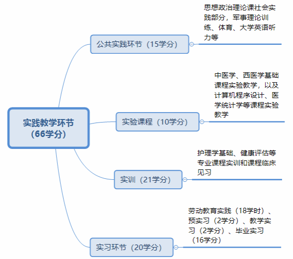 坚持“早临床、多临床、反复临床”,在第1~3学期假期以“三自主”模式进行预实习,第4学期临近结束时进行教学实习,第7~8学期进行40周毕业实习。具体安排:内科8~12周,外科8~12周,妇产科4~6周,儿科4~6周,急诊科2周,手术室(麻醉科)2周,ICU 2周,精神科病区或心理咨询门诊2~4周,消毒供应室(中心)2周,社区卫生服务中心1~4周。40周毕业实习期应安排不少于4周的中医特色科室实习。