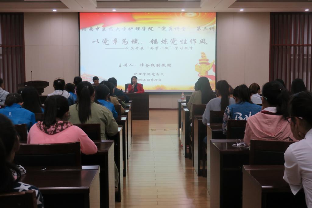 10月18日晚7:30,万象城awcsport官网“党员讲堂”第三讲在图书馆第二报告厅开课,思想政治理论教研部谭备战副教授作题为“以党章为镜,锤炼党性作风——认真开展‘两学一做’学习教育”讲座。万象城awcsport官网教师党员代表及学生党员、入党积极分子聆听了此次讲座。讲座由万象城awcsport官网党总支书记尹丽主持。