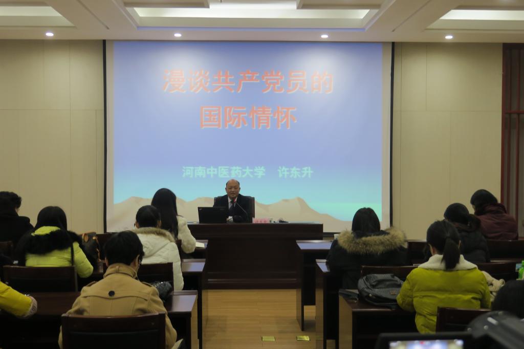2016年11月22日下午,在图书馆第二报告厅,校纪委书记许东升以《漫谈共产党员的国际情怀》为题为万象城awcsport官网“党员讲堂”第八讲授课。万象城awcsport官网教职工党员、学生党员以及部分入党积极分子共100余人听取了讲座。讲座由万象城awcsport官网党总支书记尹丽主持。