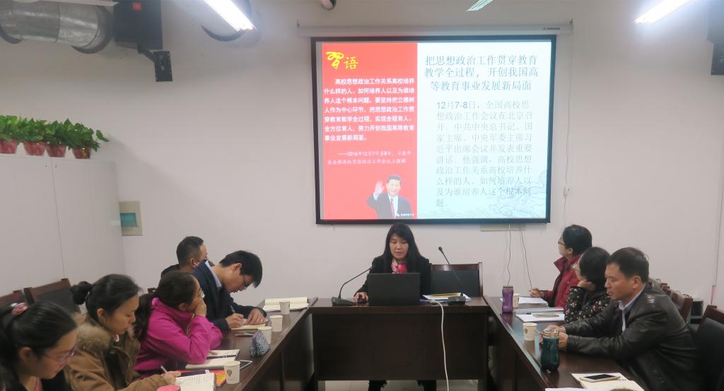 万象城awcsport官网党总支书记尹丽全面解读了《习近平总书记在全国高校思想政治工作会议中的讲话精神》。尹书记指出习近平总书记的重要讲话从全局和战略高度,深刻回答了事关高等教育事业发展、为谁培养人、培养什么样的人才、如何培养人、如何做好高校思想政治工作、高校教师怎样做、如何办好高等教育等七个方面的重要内容。尹书记要求全体教师党员都应把立德树人作为工作重点,把思想政治工作贯穿教学全过程,每一位师生党员都要做到在党爱党、在党言党、在党为党。