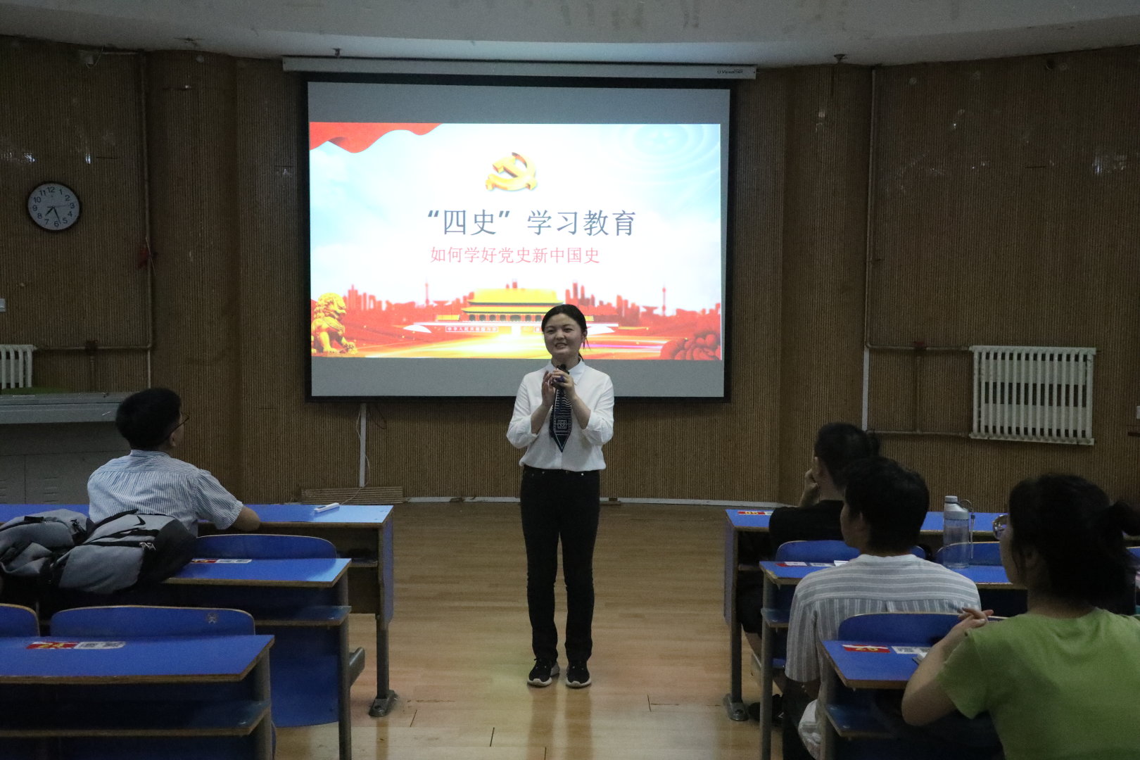 本次党课以“四史”学习教育为主题。赵珍珍老师和谭亚楠老师通过介绍有关重大事件、重要会议、重要文件、重要人物,讲述党领导人民进行艰苦卓绝的斗争历程,以及党的光荣传统、宝贵经验和伟大成就。赵珍珍老师具体阐述了如何通过新中国史更好的助力实现中华民族的伟大复兴梦。谭亚楠老师以党百年伟大贡献为出发点,向同学们介绍了党从弱到强的发展脉络,强调了认识时代意义,学会以史鉴今。