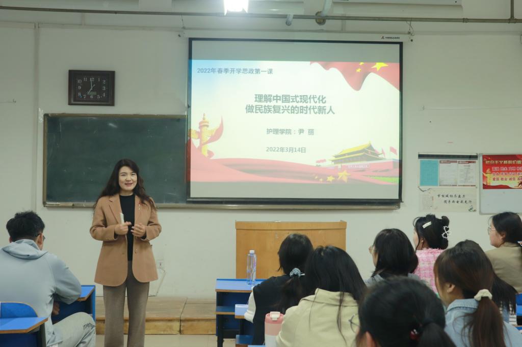 尹丽以《理解中国式现代化做民族复兴的时代新人》为题,围绕中国近代以来探索现代化道路的历程、中国式现代化的基本特征、路径取向、巨大优势等四个方面展开讲授。她带领同学们回顾近代以来我国社会各阶层在思想、经济、文化方面对现代化道路的不懈探索,中国共产党领导探索现代化路程的百年历程,指出中国共产党通过学习借鉴世界先行现代化国家的成功经验,走出了一条独有的现代化道路;她以习近平总书记论及“中国式现代化”为引入,分析了世界各国现代化的一般性特征,阐述了中国式现代化的鲜明特征,呼吁同学们坚定不移走中国特色社会主义道路,把我国建设成富强民主文明和谐美丽的社会主义现代化强国。最后,她讲解了实现“中国式现代化”的巨大优势,深情寄语同学们要热爱护理专业,发奋图强、勇于担当,为实现中国梦贡献青春力量。