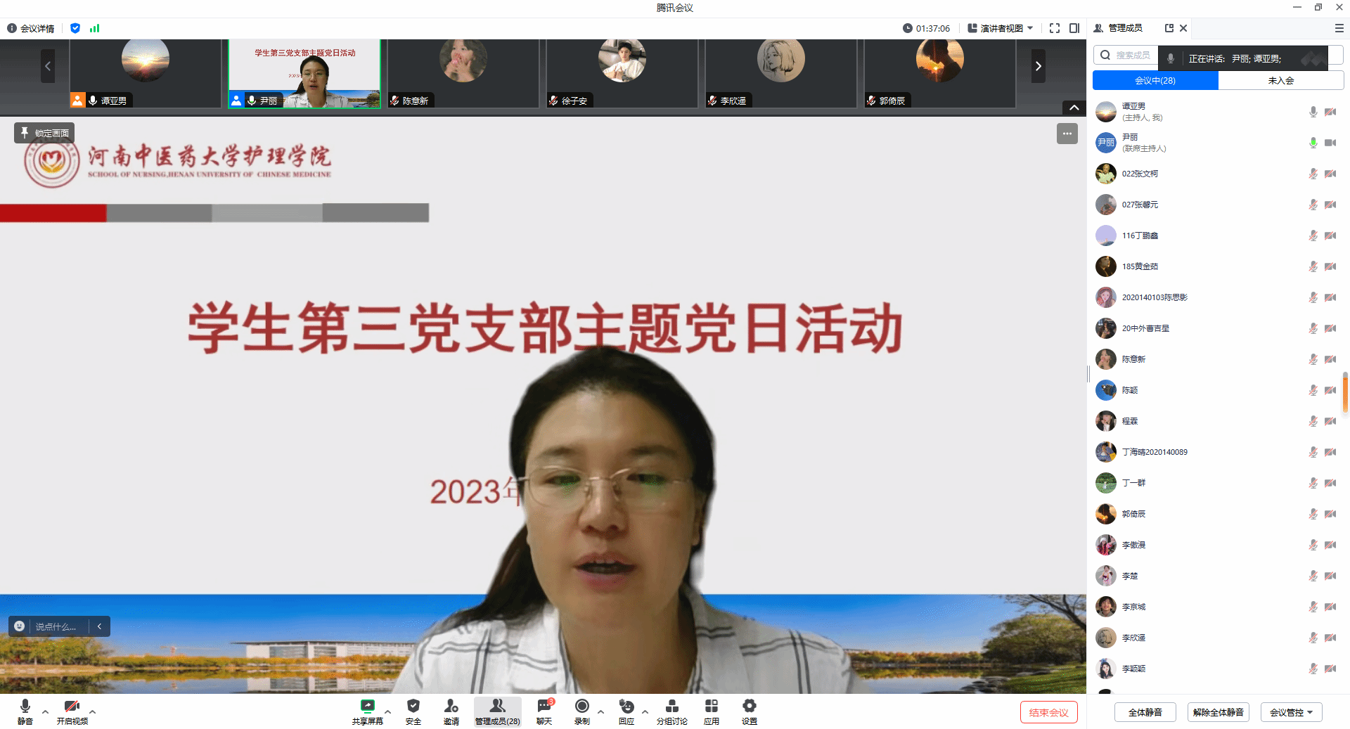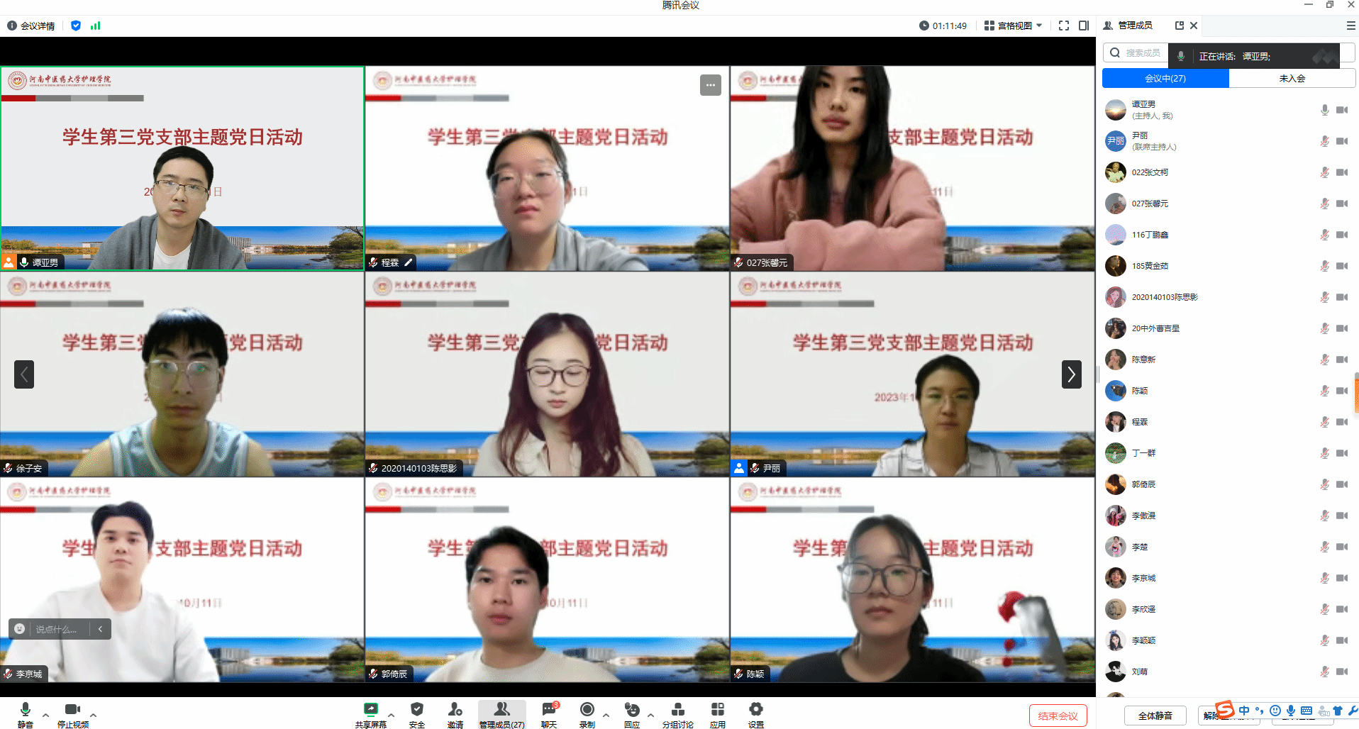 本网讯(文/图 谭亚男)2023年10月11日晚上,万象城awcsport官网学生第三党支部召开党员大会,开展主题党日活动。学生第三党支部成员主要是实习生,会议以腾讯会议的形式在线上召开,学院党委书记尹丽以普通党员的身份参加了支部活动。