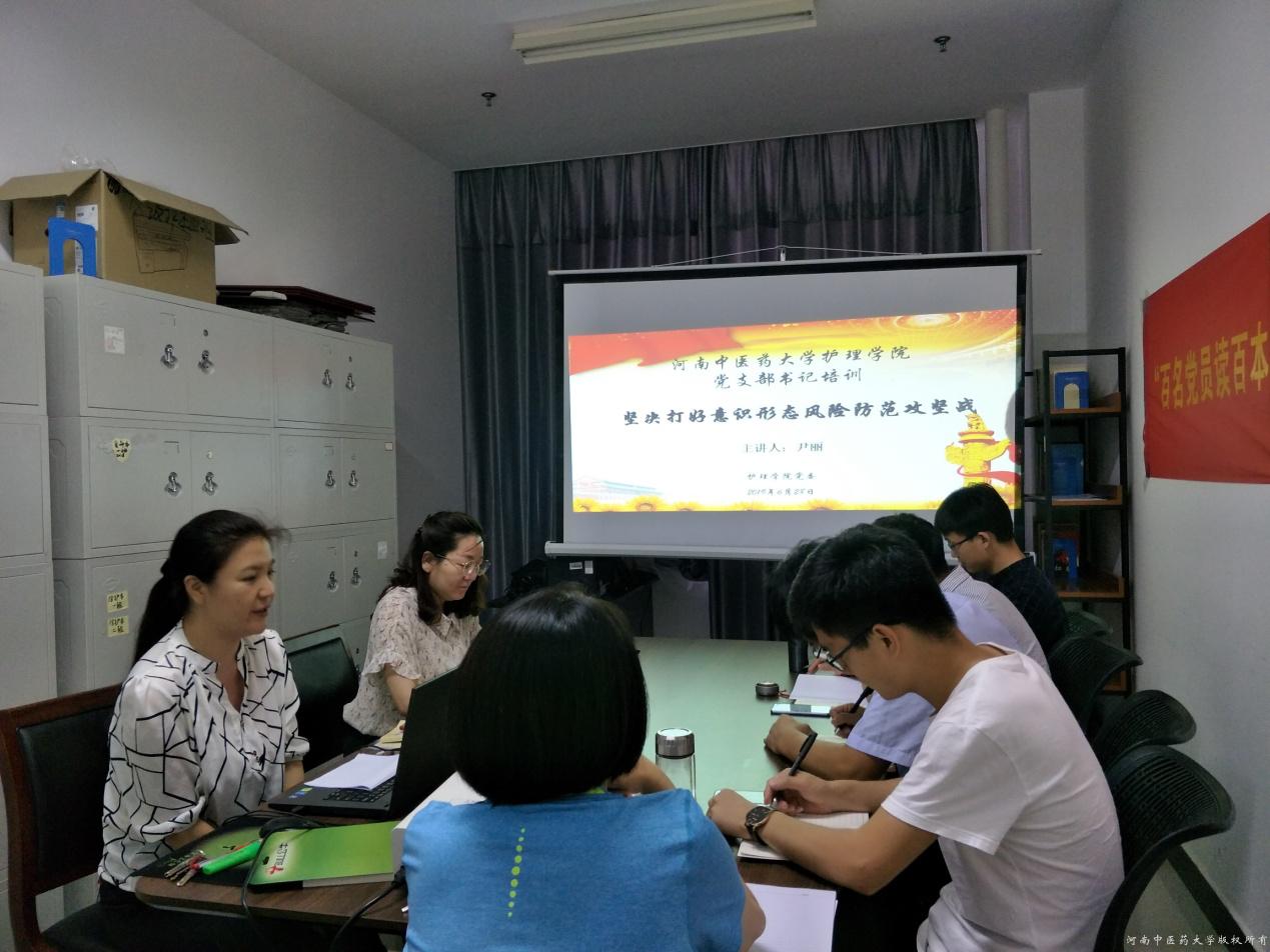 尹丽指出在迎接建党98周年,加强对支部书记的培训,提高支部书记工作能力的意义,并对支部书记如何做好工作提出了具体要求。接下来,大家在线集体收看了中国人民大学马克思主义学院刘建军教授主讲的《坚定文化自信,建设社会主义文化强国》解读和秦宣教授主讲的《习近平新时代中国特色社会主义思想学习纲要》导读。最后,尹丽为大家做了题为《坚决打好意识形态风险防范攻坚战》的讲座,结合工作实际围绕强化意识形态风险防范意识、提高意识形态风险防范能力、完善意识形态风险防范机制三个方面为大家进行了讲解。