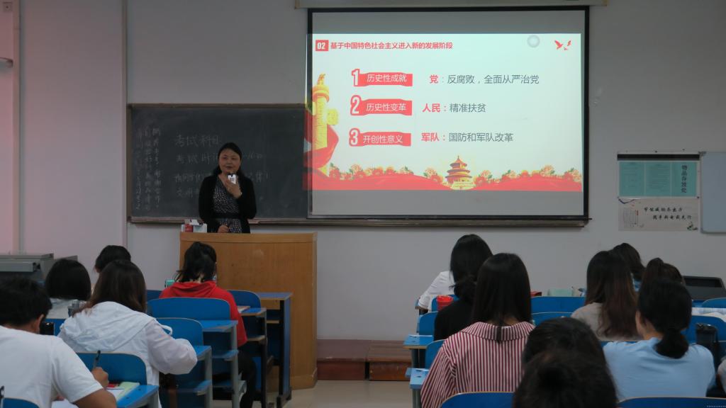 杨巧菊授课的题目是《与新时代共奋进》。杨主任首先讲了中国特色社会主义建设进入新时代,要走全面小康的道路。接着,杨巧菊介绍了护理专业的发展现状、面临的挑战,包括传染病的威胁、卫生行业发展不平衡等,提出我们需要努力满足人民群众的健康需要。最后介绍了习近平总书记在纪念五四运动100周年大会上的讲话,并组织大家观看了习近平总书记对青年一代的寄语,倡议大家拥抱新时代,释放出自己的风采,为新时代、为中国梦不懈地奋斗着。
