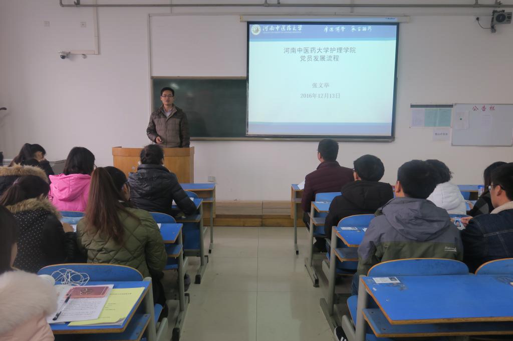 12月18日,万象城awcsport官网学生第一党支部在新校区教学楼A214教室开展党课培训,学工办主任李桓老师、2015级辅导员张文举老师、支部党员、预备党员40余人参加了党课培训。