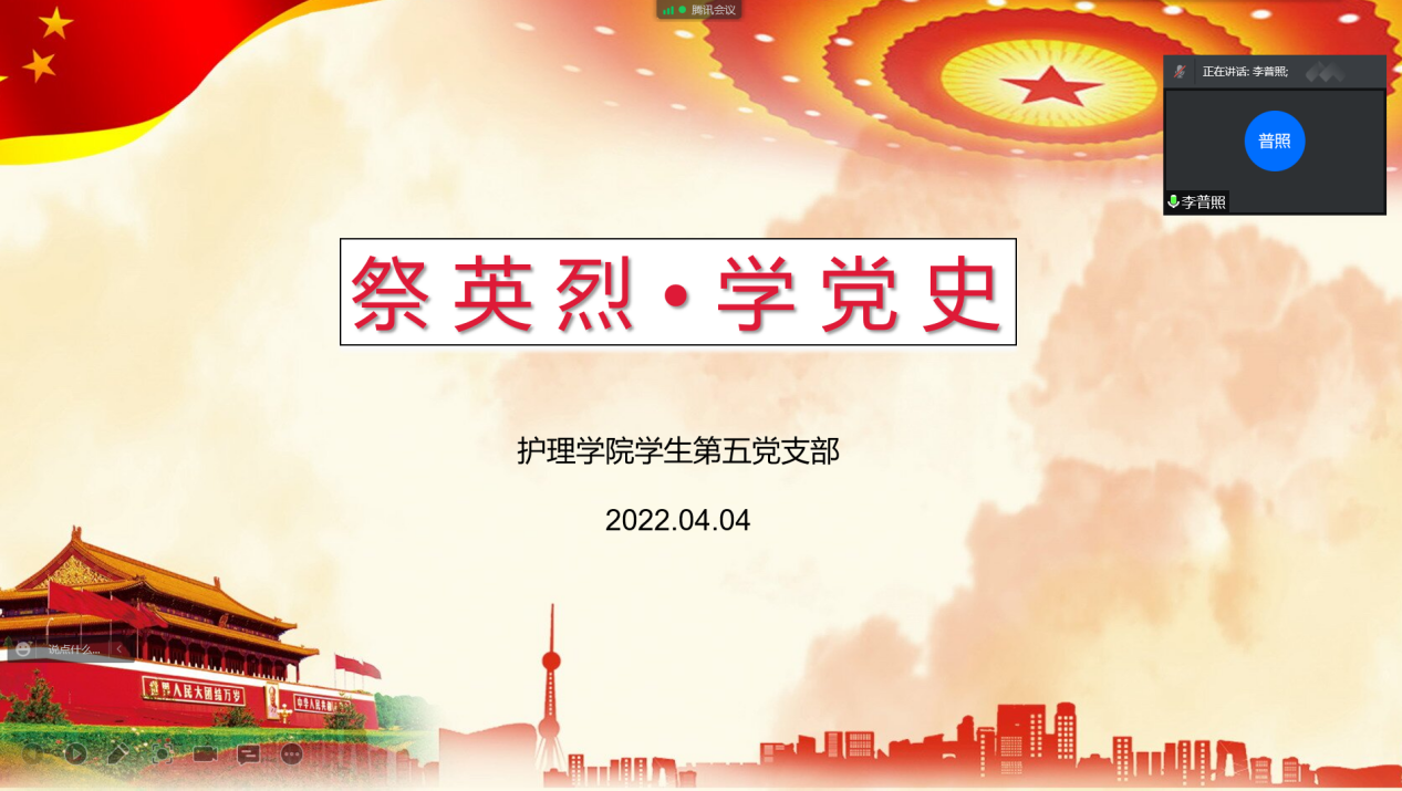 (图/文 王肖阳)为进一步加强支部青年党员的理想信念教育,引导支部青年党员缅怀革命先烈,厚植爱国主义情怀,使得家国精神代代相传,2022年4月4日,万象城awcsport官网学生第五党支部举办“祭英烈•学党史”线上演讲主题党日活动,支部全体师生党员参加。