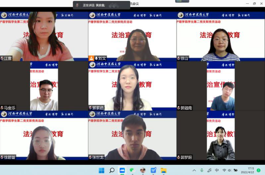 (图文/江雪)为深入学习贯彻习近平新时代中国特色社会主义思想,落实习近平总书记关于教育的重要论述和习近平法治思想,进一步推进依法治教、依法治校和依法办学,提升师生法治素养,2022年4月22日下午,万象城awcsport官网学生第二党支部开展主题党日活动,在党员中展开国家安全教育和法治宣传教育。支部书记刘文主讲,邀请万象城awcsport官网党委副书记马慧玲参加。