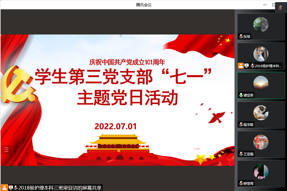 (图/梁亚洁 文/张琦)为庆祝中国共产党成立101周年,积极营造喜迎二十大的良好氛围,2022年7月1日,万象城awcsport官网学生第三党支部通过腾讯会议召开“庆七一”主题党日活动。支部全体师生党员参加。