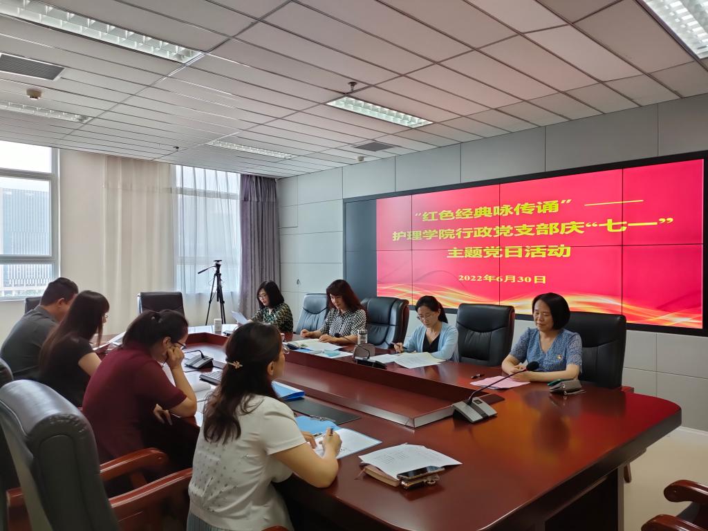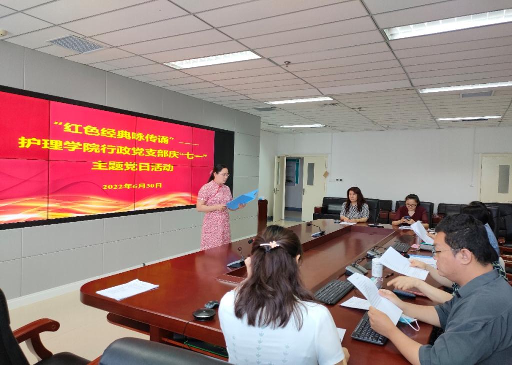 本网讯(文/周天睿 图/张璟)永远跟党走,喜迎二十大。为庆祝中国共产党成立101周年,2022年6月30日下午15时万象城awcsport官网行政党支部于综合实训楼1015会议室举办“红色经典咏传诵”暨庆“七一”主题党日活动,支部全体党员参加,活动由支部书记杨雪主持。