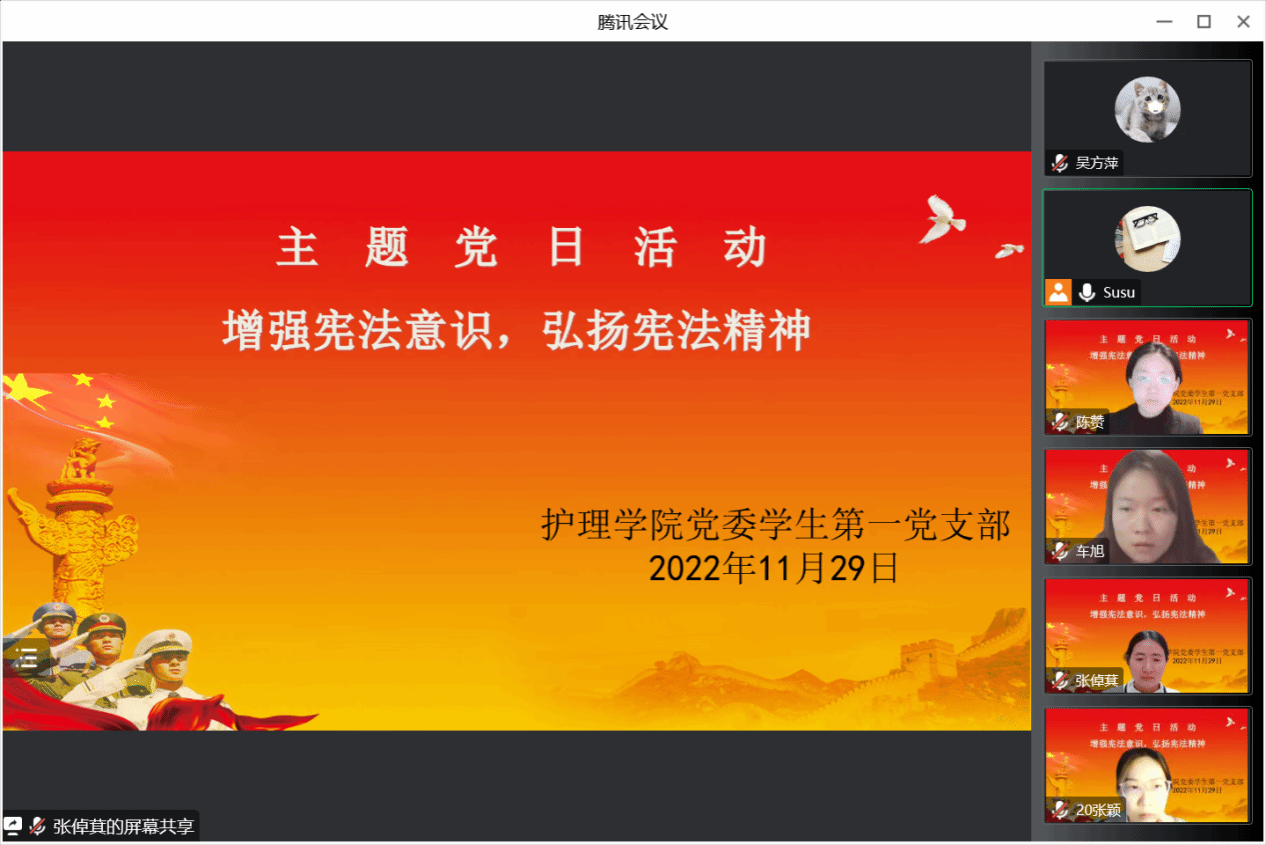 支部书记吕素首先带领大家学习了宪法的相关知识,针对什么是宪法、国家宪法日的由来、今年宪法宣传周的活动主题等问题进行详细的解读。组织统战委员张倬萁同志针对宪法的地位、作用、宪法与一般普通法律的区别等问题进行宪法知识进行领学。宣传纪检委员车旭带领大家学习习近平法治思想,坚定不移走中国特色社会主义法治道路。