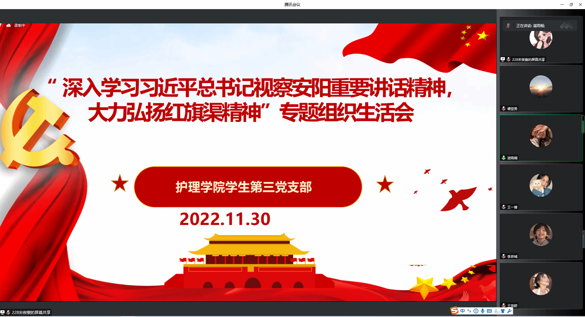 (文/图 王一博)为深入学习宣传贯彻党的二十大精神和习近平总书记视察安阳重要讲话精神,深刻领会红旗渠精神的丰富内涵和时代价值,2022年11月30日,万象城awcsport官网学生第三党支部召开了以“深入学习习近平总书记视察安阳重要讲话精神,大力弘扬红旗渠精神”为主题的线上专题组织生活会。