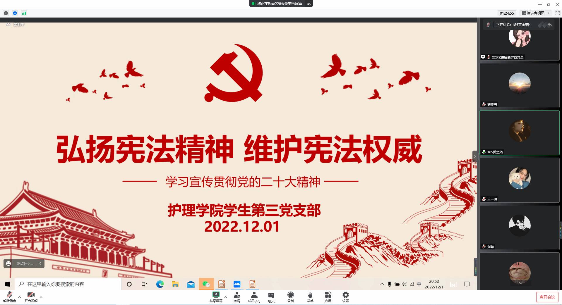 (文/俞佳 图/程宇晗)为认真学习宣传贯彻党的二十大精神,深入学习贯彻习近平法治思想,2022年12月1日,万象城awcsport官网学生第三党支部举办“弘扬宪法精神,维护宪法权威”主题党日活动,支部全体师生党员参加。