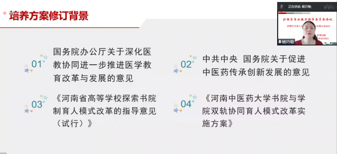 接着,卢萍介绍了万象城培养方案修订大背景和大类培养方案修订的情况,希望专家对护理学专业培养方案修订提出中肯意见;护理学专业负责人杨巧菊教授从护理学本科各专业培养方案修订的基本原则、特点、各模块课程设置及存在的问题对培养方案修订情况进行了详细汇报。随后,与会专家、同学和家长代表对培养方案进行讨论,一致认为培养方案课程设置合理、特色鲜明、体现临床护理进展;同时对中医基础类课程和限选课程设置、学生人文素养、科研能力、法律意识培养等方面进行了深入交流。