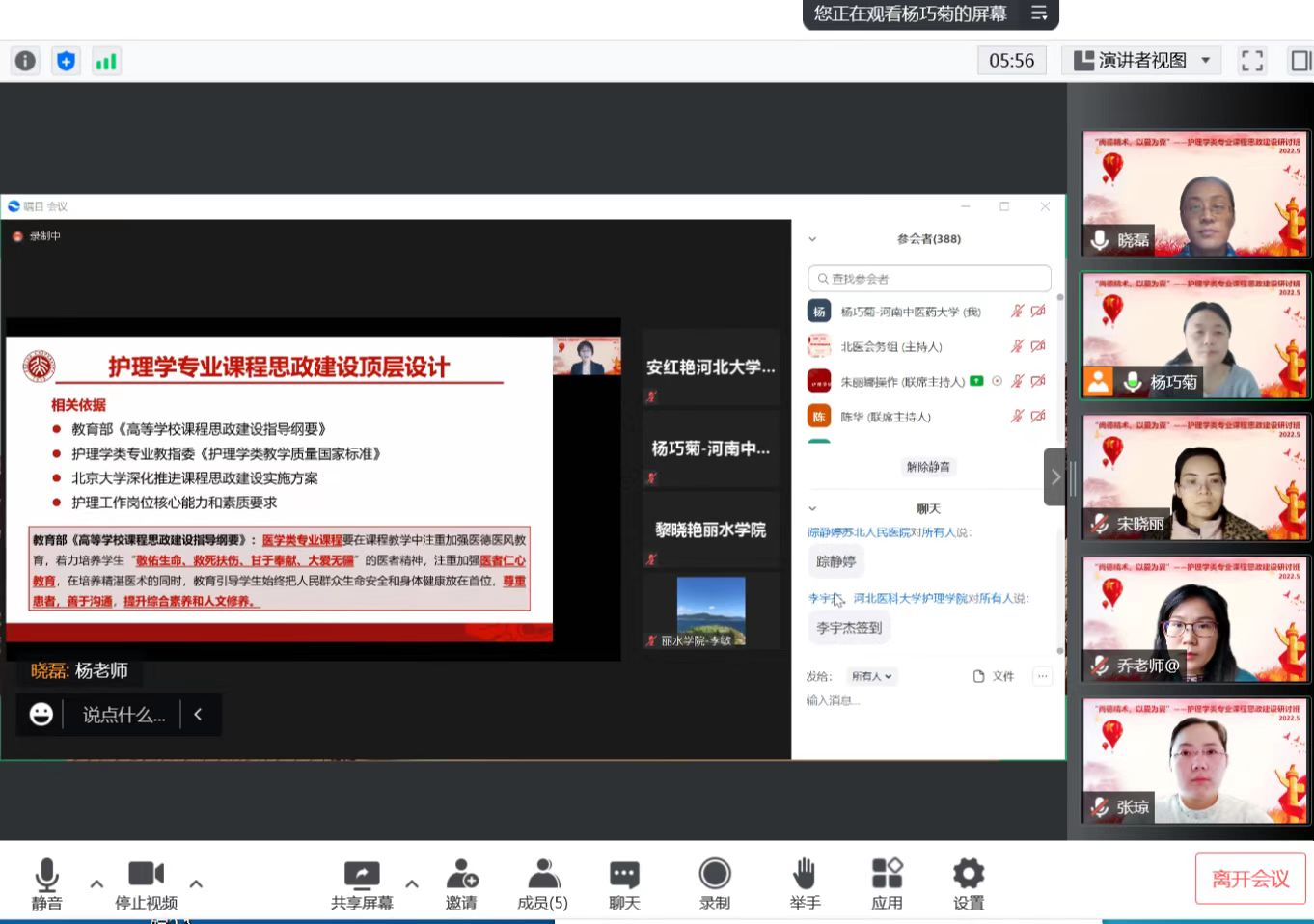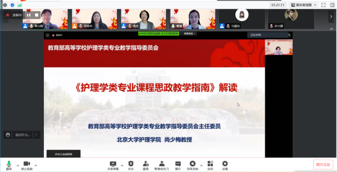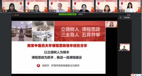 接着,各位专家对课程思政建设经验进行分享,教育部护理学类教学指导委员会副主任委员、南京中医药大学副校长徐桂华教授分享了南京中医药大学万象城awcsport官网课程思政建设经验,各教指委委员及北京大学万象城awcsport官网老师还分享了《护理管理学》《护理学基础》《护理人文关怀》《健康评估》《护理研究》《护理学导论》以及社会实践课程建设经验,北京大学基础医学院张卫光教授还分享了北京大学医学课程思政的教学经验。