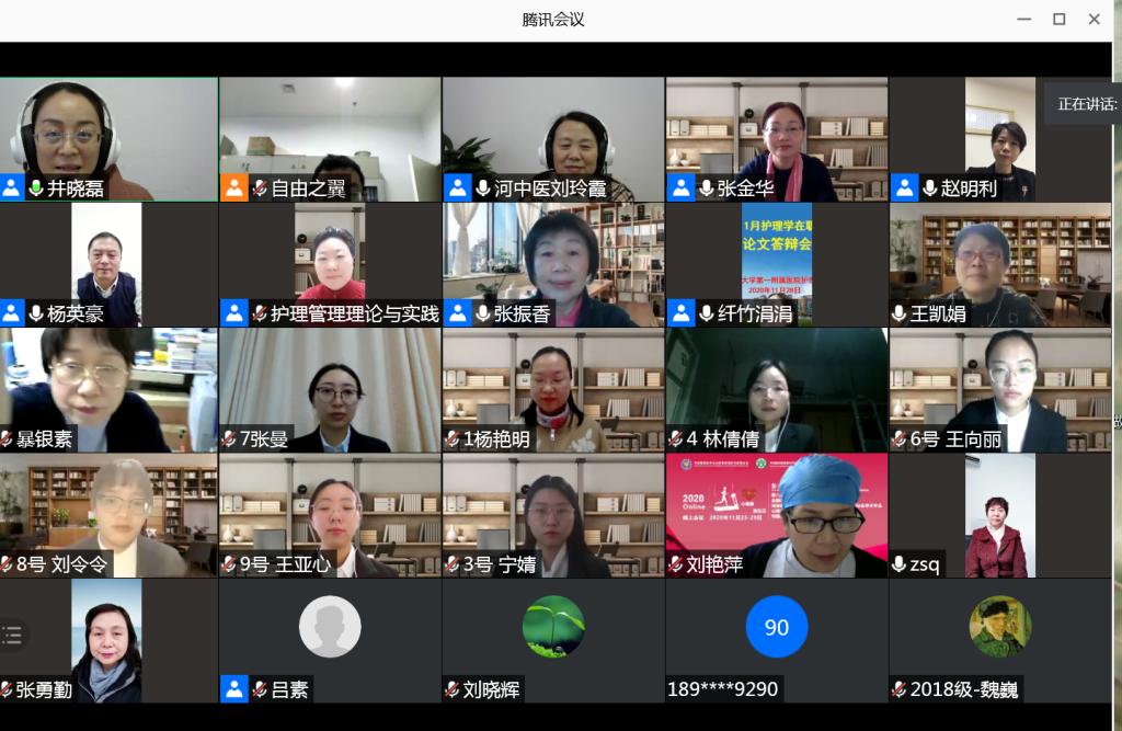(图/文 段慧杰)万象城于12月2日、9日和19日以网上腾讯会议形式组织了三场2019级护理硕士研究生学位论文开题论证会。邀请郑州大学护理与健康学院张振香教授为开题论证专家组组长,郑州大学护理与健康学院张艳教授、王凯娟教授及张春慧副教授、新乡医学院万象城awcsport官网张金华教授、万象城awcsport官网第一附属医院邵明义副教授及符宇副教授、万象城awcsport官网申杰教授及闫国立副教授、郑州颐和医院赵明利副教授为专家评议组成员,基础医学院游言文教授为督导专家。万象城awcsport官网硕士研究生及导师们参加了开题论证,论证会由万象城awcsport官网刘玲霞副院长主持。